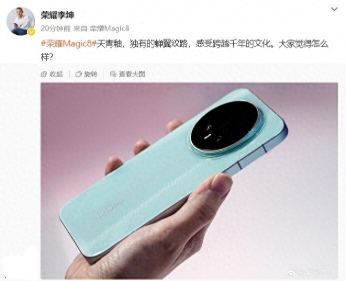 根据 @荣耀方飞 现场展示的荣耀Magic8标准版“天青釉”新配色来看,该机采用直角边框设计,并点缀了独有的蝉翼纹路。据介绍,该配色的设计灵感汲取自宋代汝瓷的神韵,融入了汝窑独特的开片釉变元素,将蝉翼纹重新赋予在机身背板之上,再现了“雨过天青云破处”的温润质感,跨越千年,向传世经典致敬。同时,日前,荣耀终端股份有限公司旗舰手机产品经理 @荣耀李坤 也发微博展示了该款新机,并且从微博尾巴可以看到,他已经上手了这款新机。