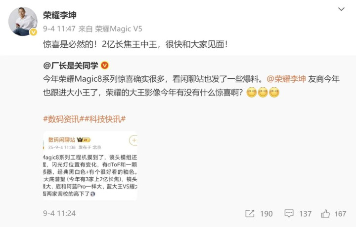 除了硬件性能和系统AI等亮点之外,其实影像也是荣耀Magic8系列的另一大亮点。根据各位高管透露的信息显示,该系列新机将配备2亿像素长焦镜头,@荣耀方飞 还曾发文透露:“即将和大家见面的下一代Magic系列,不止是主摄,我们还将带来2亿长焦下的超强蓝调,不同焦段随手就能拍,远近都很美。”